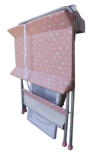 Baby Diego's standard bathinette makes life a little easier for parents. It offers the comfort and practicality of an elevated bathing and changing station. No more bending to bathe baby in the tub. Caddy compartments and lower storage space keep towels, toys, diapers and bathing supplies neatly organized. The changing pad includes a safety strap and is made of soft non-toxic cushioned vinyl, great for baby diaper emergencies as the pad can be easily wiped clean. The stylish stand allows for it to be folded and stored if necessary.Length 32Width 18Weight Capacity 30Height 35Suggested age 0-18 monthsSuggested weight 30 lbs.Color Pink
