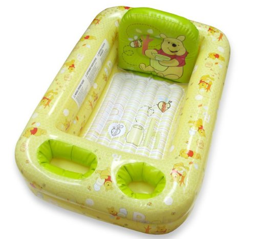 Inflatable Disney Winnie the Pooh Bathtub provides the perfect sized environment for little ones. The air cushioned tub includes a supportive back piece to help parents easily maneuver baby during the splish and splash session. The front of the tub includes two pockets to store and quickly access all bathing necessities. Attached hook allows you to easily hang to dry. Deflate for storage or travel.