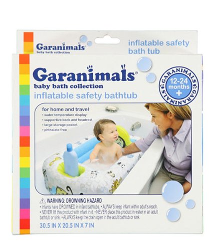 Inflatable Garanimals Bathtub provides the perfect sized environment for little ones. The air cushioned tub includes a supportive back piece to help parents easily maneuver baby during the splish and splash session. The front of the tub includes two pockets to store and quickly access all bathing necessities. Attached hook allows you to easily hang to dry. Deflate for storage or travel.