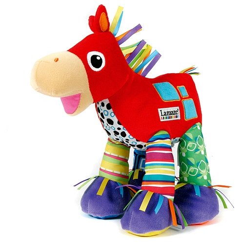 Totter the Pony is a soft developmental toy that rewards child with fun electronic sounds when legs are pulled. This stuffed animal features include colorful satin ribbon, patterns, textures and crinkle.
